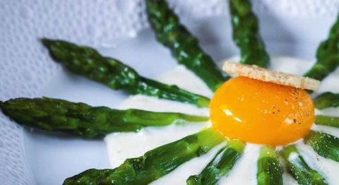 Découvrez la recette d'asperges vertes poêlées avec un jaune d'œuf coulant