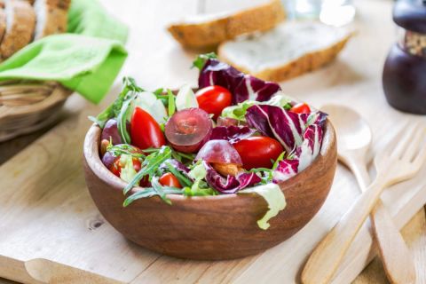 Dans un bol, mélangez la moutarde, le vinaigre et l’huile d’olive pour préparer une vinaigrette.