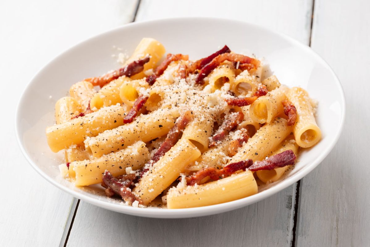 Simone Zanoni propose une émulsion généreuse qui enrobe les pâtes sans les alourdir. Contrairement aux classiques pâtes à la carbonara, la sauce ici est concoctée sans jaunes d'œufs. Elle se prépare simplement avec du guanciale croustillant, du pecorino et... de l'eau de cuisson des pâtes. C'est tout! Cette variante, que l'on appelle les pâtes à la gricia, allie saveur et légèreté.